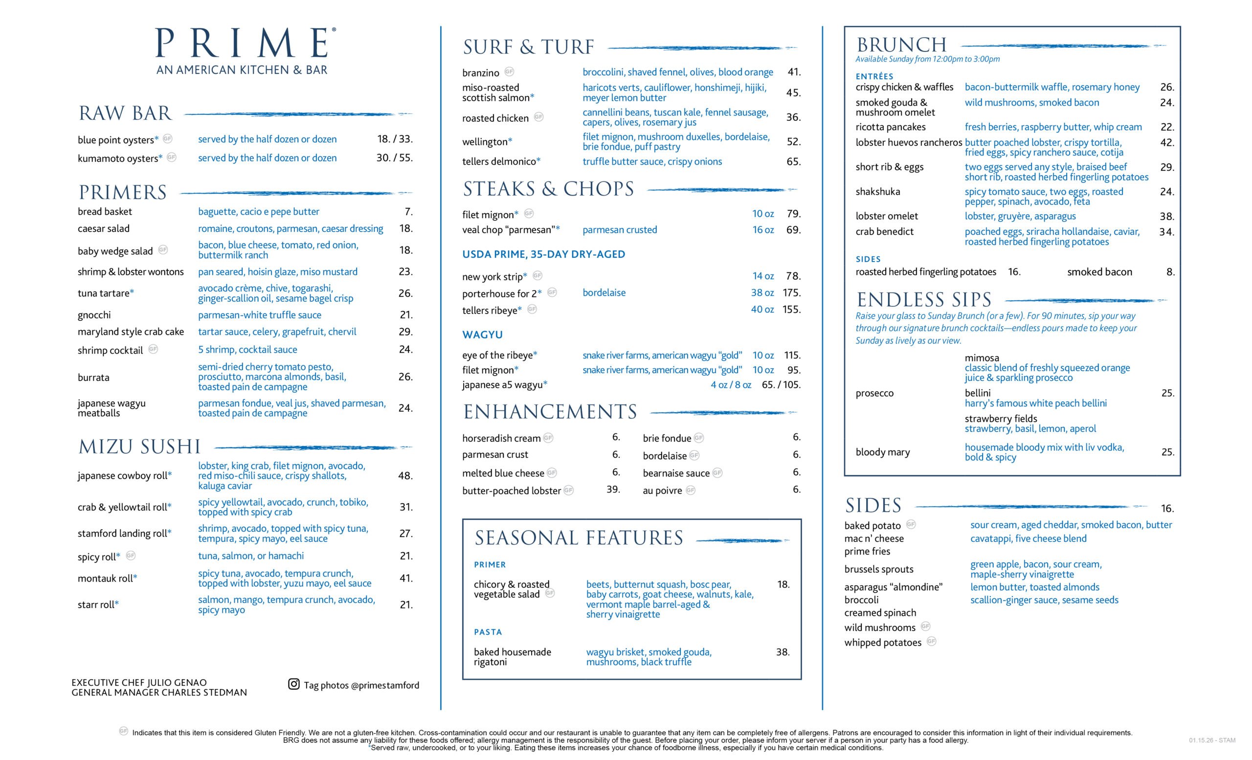 Sunday brunch menu for Prime; call to learn more.
